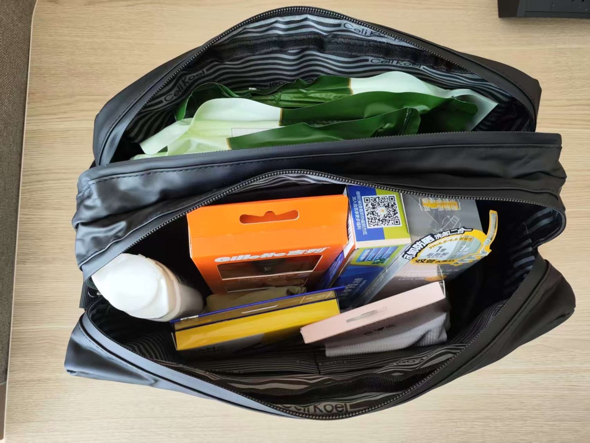 郑州升达经贸管理学院的志愿者侯安岚,参与了这些洗漱包的发放工作。每个包里不仅有一次性浴巾、洗脸巾、洗发水、洗面奶、剃须刀和牙膏,甚至还准备了不同的一次性内衣。